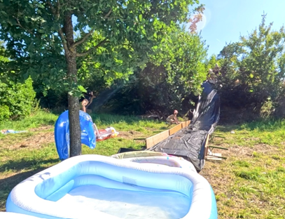 Das absolute Highlight: die selbstgebaute Wasserrutsche. Mit Luftbooten rasten die Kinder den Hügel hinunter, schossen über eine Rampe und landeten spektakulär im Pool.