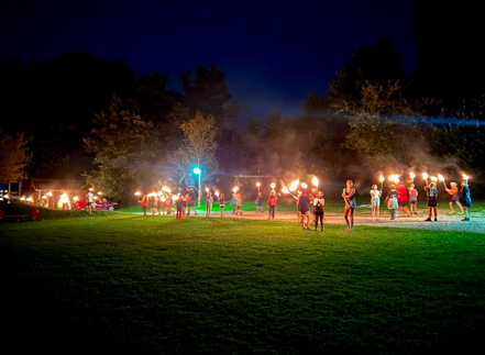 Nachdem die Eltern den Abend gemütlich ausklingen ließen, starteten die Kinder gemeinsam zu einer Fackelwanderung. Den Höhepunkt erhielt der Abend mit „Neon-Fußball“ im faszinierenden Schein der Fackeln und einem packendem Werwolf-Spiel am Lagerfeuer. Der Abend endete mit einem Film auf einer riesigen Leinwand. Nach einem Tag voller Eindrücke und Action schliefen die Kinder schnell ein.