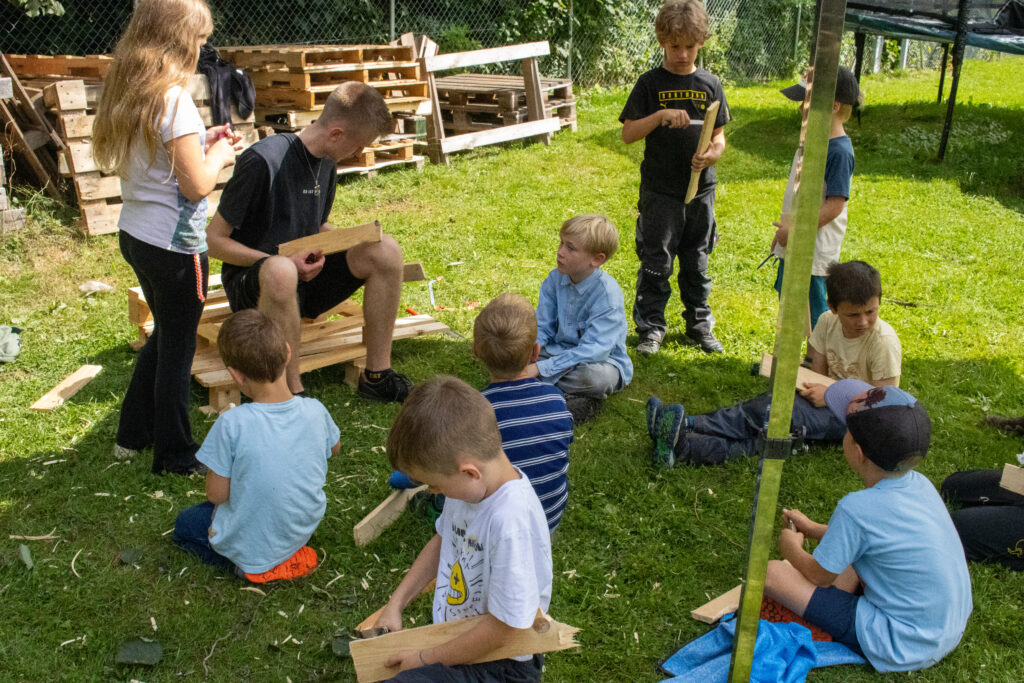 Kaum angekommen, legten die Kinder auch schon los: Überall wurde gebaut, gehämmert und geschraubt. Mit Paletten, Holz, Ästen und sogar alten Schränken entstanden die kreativsten Lager. Nebenbei wurden Lose verkauft, Schaukeln aufgehängt, Tische und Bänke gezimmert. Aber auch Basteln, Schnitzen, Färben und natürlich gemeinsames Chillen mit Freunden standen hoch im Kurs.
